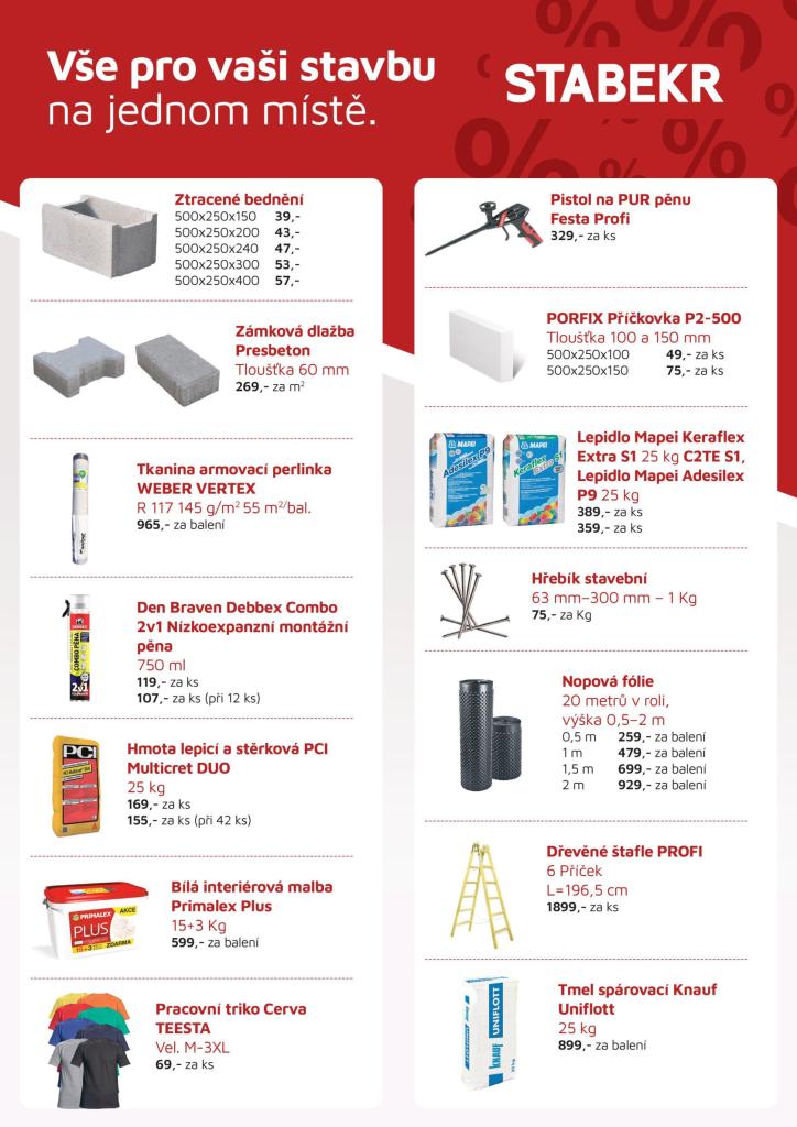 Stavebniny STABEKR v Horní Lidči si přichystali jarní akci na vybrané položky. Výhodně nakoupíte např. zámkovou dlažbu, ztracené bednění, nehašené vápno, interiérovou malbu Primalex, zahradnický substrát, nebo nopovou fólii. Více se dozvíte na webových stránkách stavebnin, kde najdete i kompletní sortiment půjčovny a služeb. Nabídka sortimentu ve stavebninách STABEKR se pomalu rozšiřuje. Nově v nabídce najdete českého výrobce dveří DOORNITE. Nebo ve stavebninách najdete několik druhů okrasných kameniv.