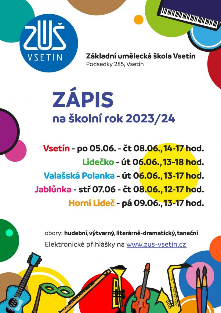 Základní umělecká škola Vsetín, odloučené pracoviště Horní Lideč, zve všechny zájemce o studium k zápisu, který proběhne v pátek 9. června v době od 13:00 do 17:00 hodin na pobočce v Horní Lidči v budově základní školy v pavilonu nad jídelnou.