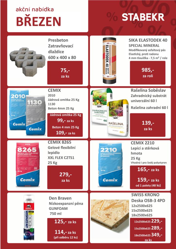 Stavebniny STABEKR v Horní Lidči si přichystali akci na vybrané položky. Výhodně nakoupíte např. zatravňovací dlaždice, beton, štěrkovací lepidlo, OSB desky, nebo zahradnický substrát. Více se dozvíte na webových stránkách stavebnin, kde najdete i kompletní sortiment půjčovny a služeb.