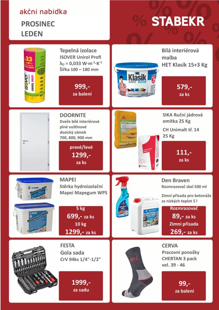 Stavebniny STABEKR v Horní Lidči si na období prosinec - leden přichystali akci na vybrané položky. Výhodně nakoupíte např. bílou interiérovou barvu HET, hydroizolaci do koupelen, plné bílé dveře, nebo pracovní ponožky. Více se dozvíte na webových stránkách stavebnin, kde najdete i kompletní sortiment půjčovny a služeb.