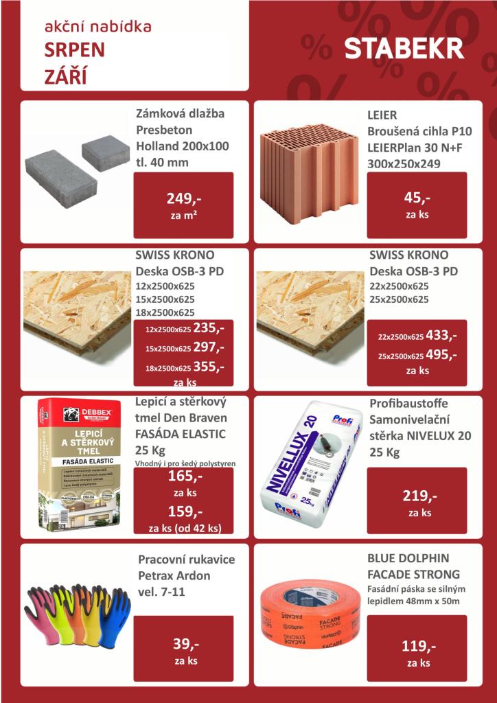 Stavebniny STABEKR v Horní Lidči si přichystali akci na vybrané položky. Výhodně nakoupíte např. zámkovou dlažbu, broušené cihly, OSB desky, palisády, nebo tvrzený polystyren. Více se dozvíte na webových stránkách stavebnin, kde najdete i kompletní sortiment půjčovny a služeb.