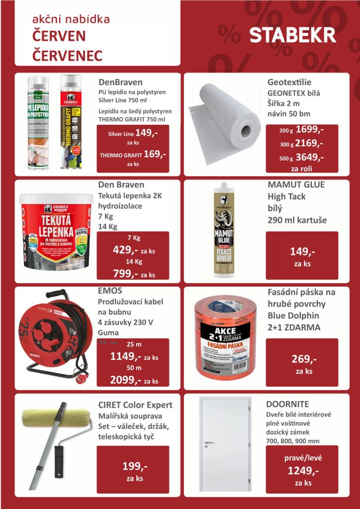 Stavebniny STABEKR v Horní Lidči si přichystali akci na vybrané položky. Výhodně nakoupíte např. zatravňovací dlaždice, vymývanou dlažbu, písek do bazénové filtrace, interiérové dveře, nebo stavební kolečko. Více se dozvíte na webových stránkách stavebnin, kde najdete i kompletní sortiment půjčovny a služeb.